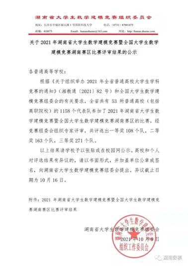 近日,由教育部高等教育司和中国工业与应用数学学会共同主办的2021年“高教社杯”全国老员工数学建模获奖名单正式公布。公司由张晓红教授指导的五支队伍,经湖南赛区数学建模组委会认定,分别获得一等奖2项,二等奖1项,三等奖2项。