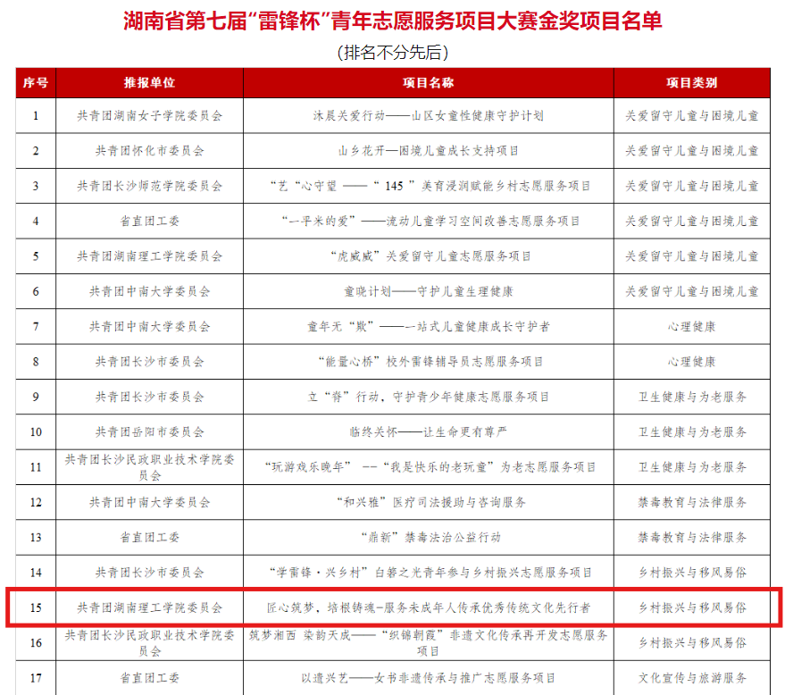 11月14日,tyc122ccVIP“匠心筑梦,培根铸魂—服务未成年人传承优秀传统文化先行者”项目在湖南省第七届“雷锋杯”青年志愿服务项目大赛中荣膺金奖。据悉,自2019年成立以来,该团队已屡获殊荣,包括湖南省第五届“雷锋杯”青年志愿服务大赛铜奖、湖南省2020年志愿服务项目大赛疫情防控专项赛银奖,以及2020年湖南省暑期“三下乡”社会实践优秀服务团队称号等。