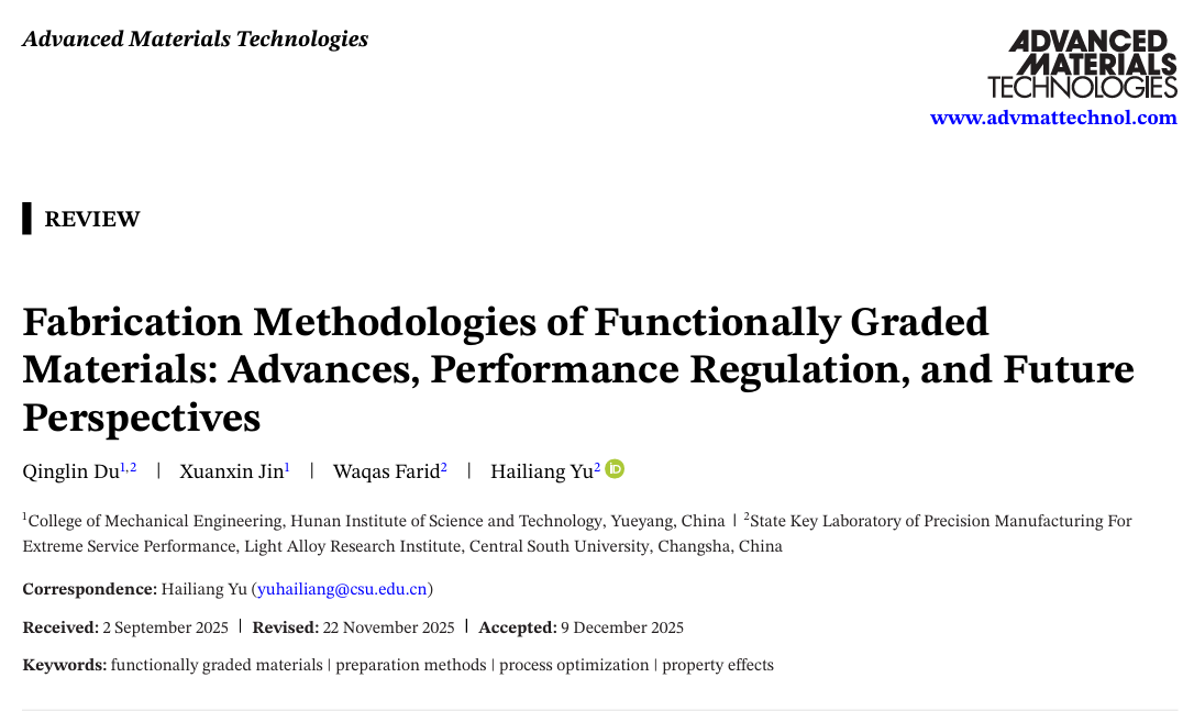 近日,公司2022级机械设计制造及其自动化专业本科员工金轩信,在杜青林博士的悉心指导下,历时一年完成了综述论文“Fabrication Methodologies of Functionally Graded Materials: Advances, Performance Regulation, and Future Perspectives”成功发表于国际知名学术期刊“Advanced Materials Technologies”(SCI三区,影响因子:6.2)。
