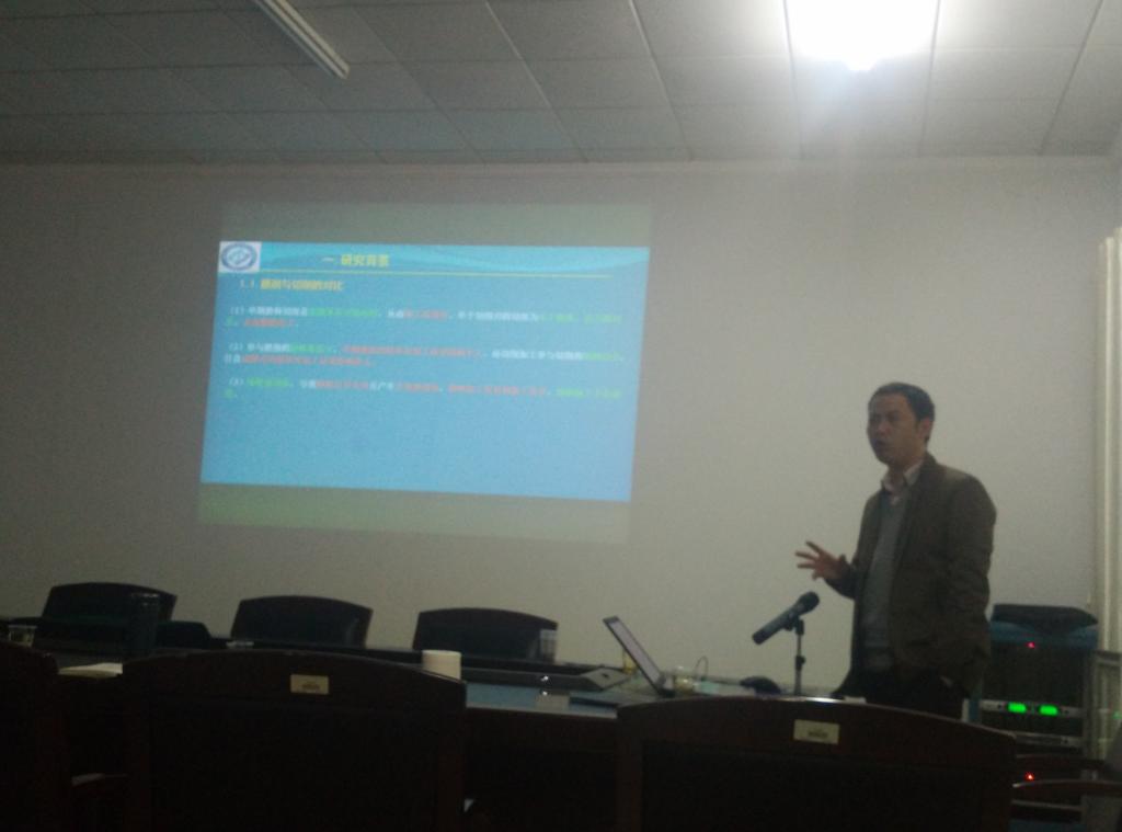 毛聪教授从研究背景,CBN-WC-10Co刀具材料的制备,激光切割处理,单纤维切削性能及螺旋有序排布纤维刀具切削性能,最后得出的结论几个方面报告了自己的目前的研究内容及成果。毛教授根据自己近期研究的课题,作了具体研究过程及如何得出成果的报告,个人魅力深深地折服了在场的每位同学。