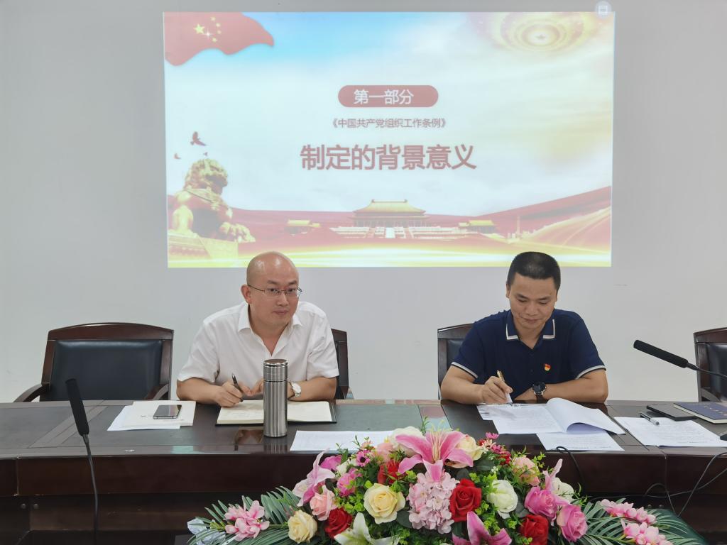 胡文静介绍了《条例》出台的背景与意义、制定的主要原则、主要框架与内容,重点学习了《条例》的主要内容:一是落实新时代党的组织路线,包括组织工作必须遵循的基本原则,突出“以组织体系建设为重点”,干部工作、人才工作的总要求;二是体现党对组织工作的全面领导,将党的领导贯穿全篇,写入指导思想、根本任务和根本原则,将坚持党的领导贯穿全篇;三是党的组织体系建设要求,对组织架构、组织功能、党员队伍、组织制度、组织生活、组织纪律等作出全面规定;四是干部工作要求新时代干部工作“五个坚持”,即坚持党管干部原则;坚持德才兼备、以德为先;坚持五湖四海、任人唯贤;坚持好干部标准;坚持正确用人导向;五是人才工作方面,对领导体制、队伍建设、资源开发、机制体制改革、政治吸纳和人才环境等方面都作出了具体规定。