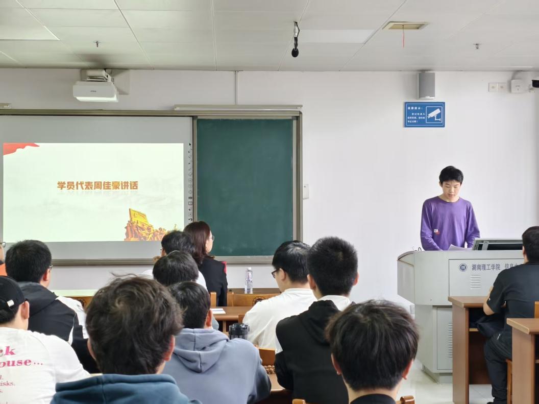 随后,入党积极分子代表周佳豪上台发言。他代表全体学员表达对于参加此次党校培训的热切期待与坚定决心,承诺将严格遵守培训纪律,系统学习党的理论,不断提升思想政治素养与综合能力,以实际行动积极向党组织靠拢。
