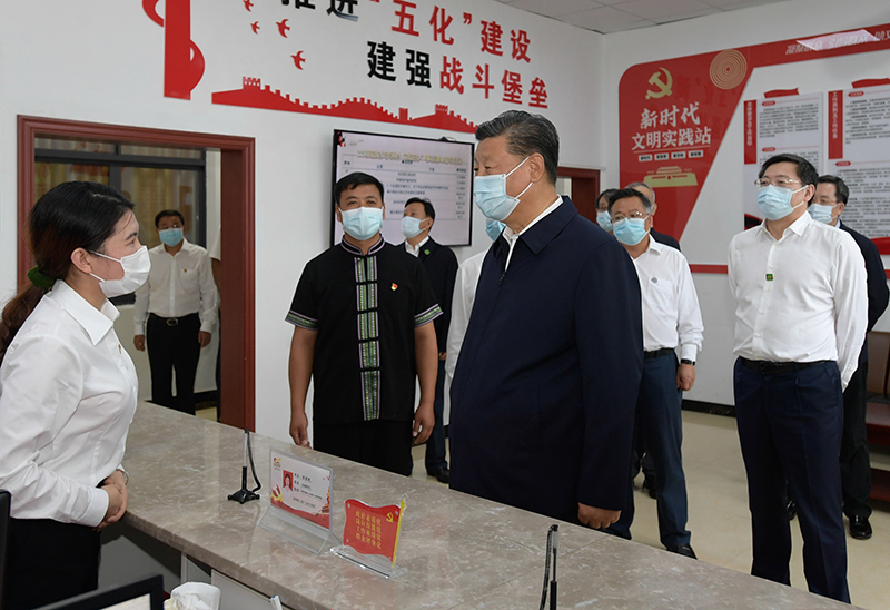 9月16日至18日,中共中央总书记、国家主席、中央军委主席习近平在湖南考察。这是16日下午,习近平在郴州市汝城县文明瑶族乡沙洲瑶族村服务中心,了解基层公共服务工作情况。新华社记者 李学仁 摄