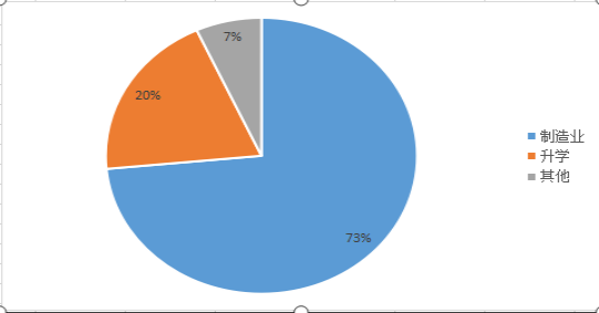 从图1可知,公司2018届毕业生从事制造业的员工大约占到73%左右,从事其他行业的大概占了7.00%,升学(考研52人)占20%。这说明大部分员工基本上找到了与专业相匹配的工作,还有一部分员工以追求更大的发展空间和潜力选择继续深造,还有7%的员工选择个性化的就业道路,来快速有效实现自己的人生理想。