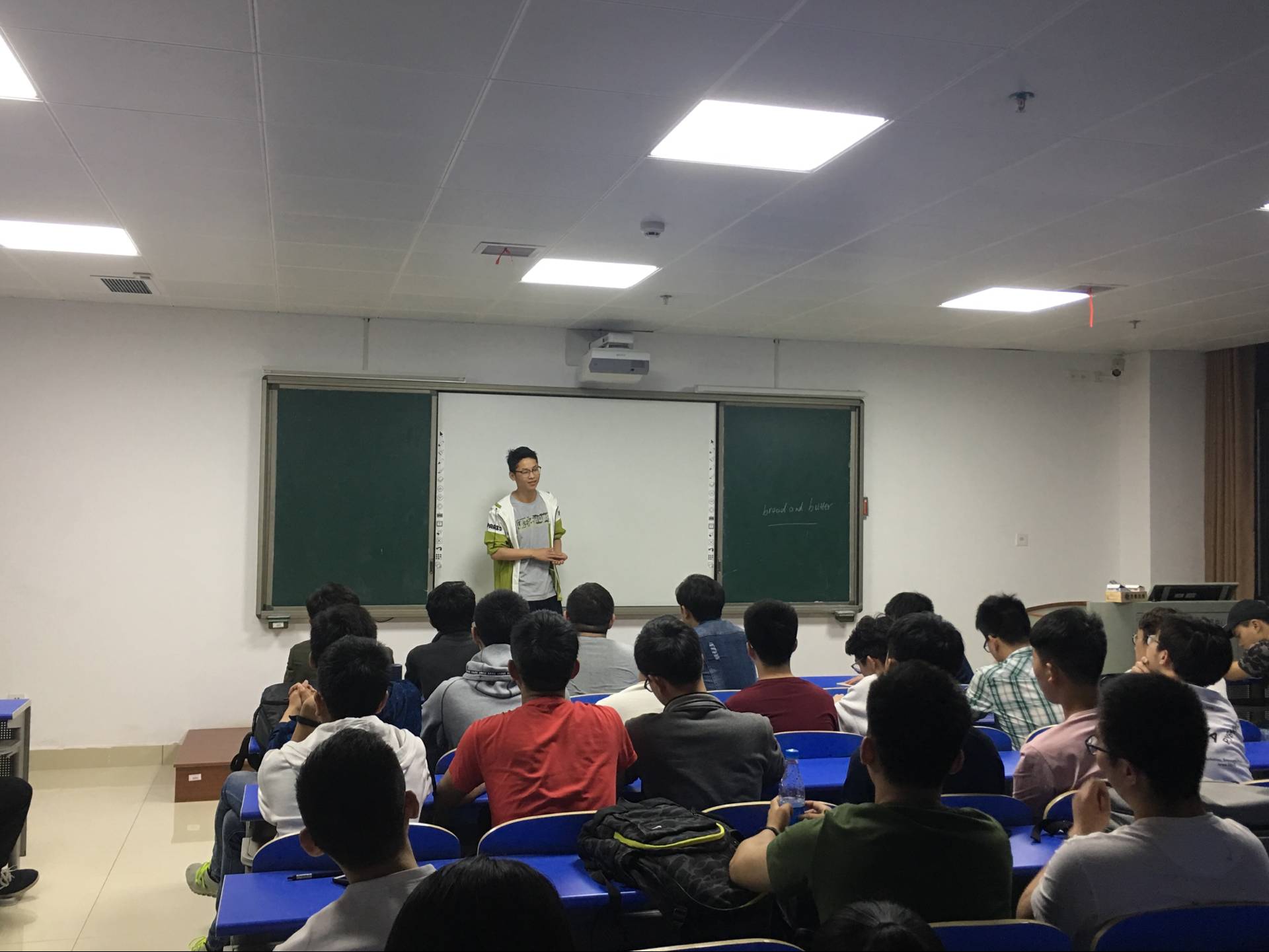 杨海学长从怎样选择考研学校以及如何复习两个大方面入手,详细地分享了他的考研经验。他提醒同学们在选择学校之时要根据自身实力,从专业排名、综合实力和地理位置入手,分别选择略高于自身实力、与实力对等和略低于自身实力的三个学校。并让同学们不仅仅要关注分数线,更要了解意向学校的报录比以及确定自己对于学硕和专硕的选择。在说到如何复习时,他重点提及了数学和英语的复习。他认为:数学要分阶段复习,在“刷真题”阶段要重视查漏补缺,整合各个题型对应的考点,随后,他分析了现在市面上著名的几大老师教学方法的区别及其优劣;英语也应该多做真题,在进行单词的记忆的同时,可以自行归纳核心。杨海学长分享结束之际,语重心长地送给了同学们一句话:考研并非易事,也不是唯一的路,不要盲目跟风。