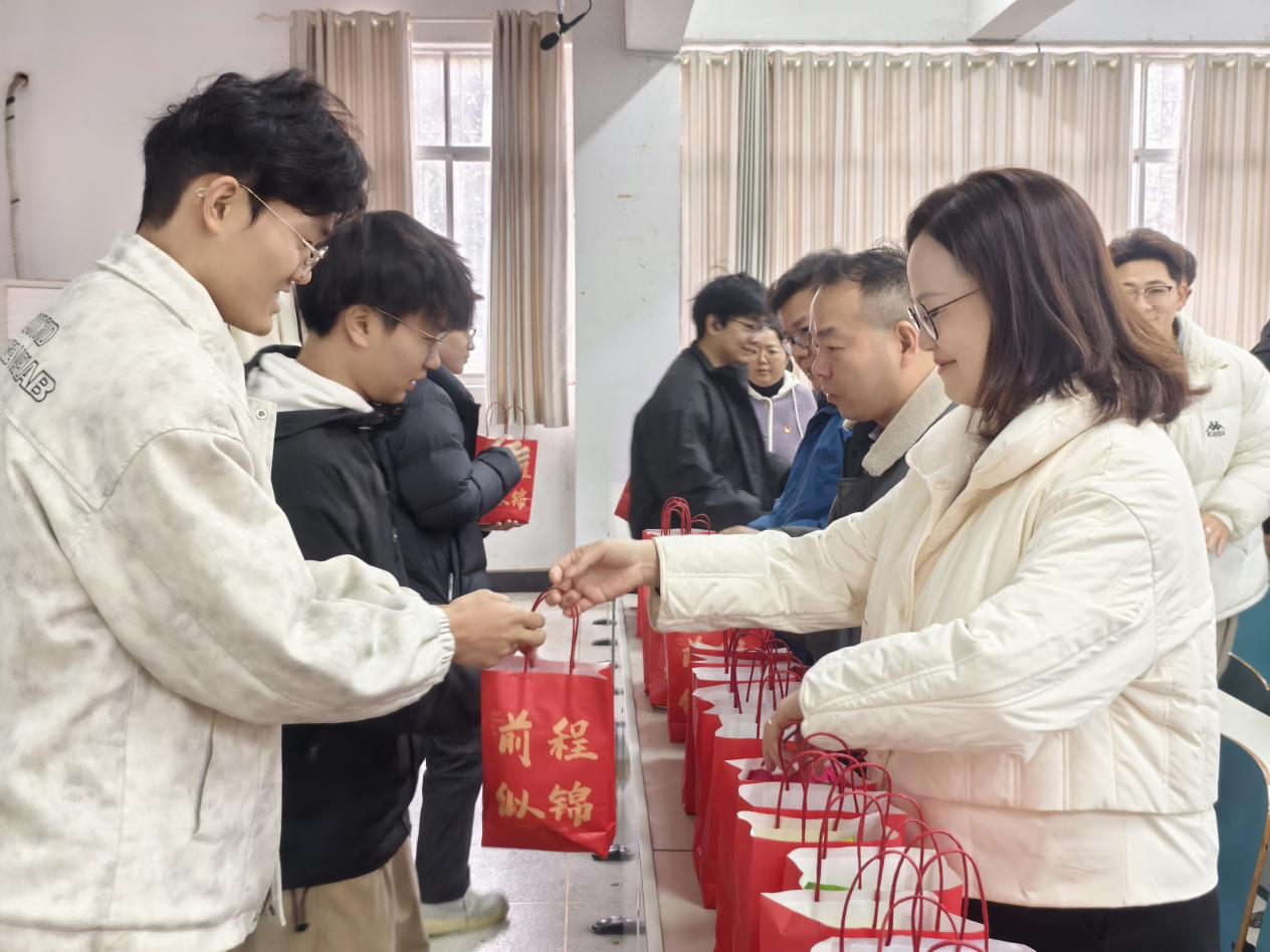 现场还为考研学子们送上了精心筹备的“考研慰问礼包”。礼包内不仅有寓意“前程似锦”的定制礼品袋,更有补充能量的士力架、薯片,驱散寒意的暖宝宝,以及象征“心想事成”的橙子等贴心好物。每一份慰问品都承载着学院对学子们的深切关怀与美好期许,让寒冬中的备考之路暖意融融,也让同学们感受到了来自学院大家庭的强大支持与温暖力量。