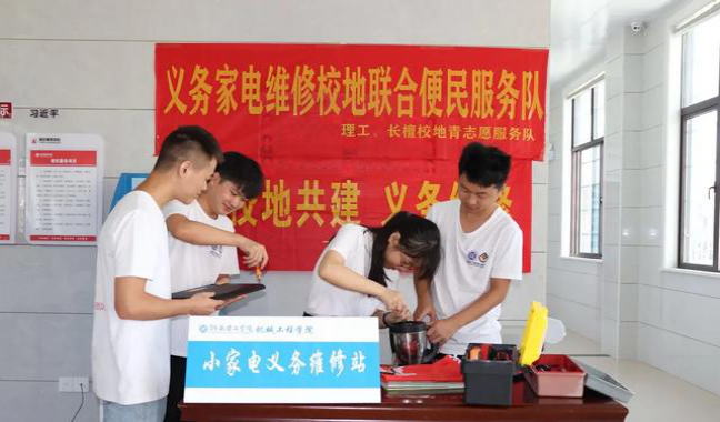 在长檀社区,tyc122ccVIP暑期社会实践团队设立了义务维修点,为社区居民提供小家电义务维修服务,与岳阳市图书馆在社区成立了移动便民书屋,还开展了“讲好红色故事,传承红色基因”书展活动,义务给社区小朋友进行课业辅导。