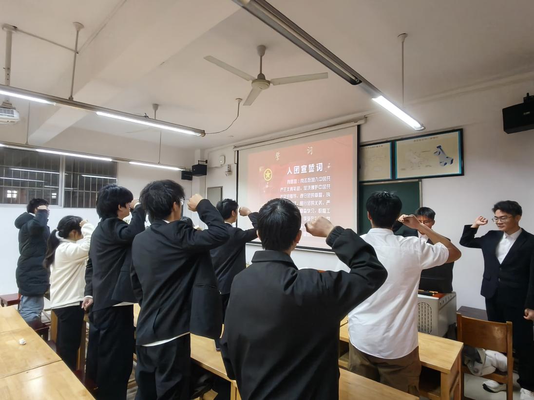 在庄严的入团宣誓环节,学院团委分会干事何志能、姚庆带领全体新发展团员,面向熠熠生辉的中国共产主义青年团团旗,高举右拳,庄严宣誓。铿锵有力的誓言在教室中回荡,不仅是新团员对团组织的郑重承诺,更彰显了他们将个人专业理想融入国家装备制造业发展大局,为实现中华民族伟大复兴中国梦贡献机械力量的坚定信念。